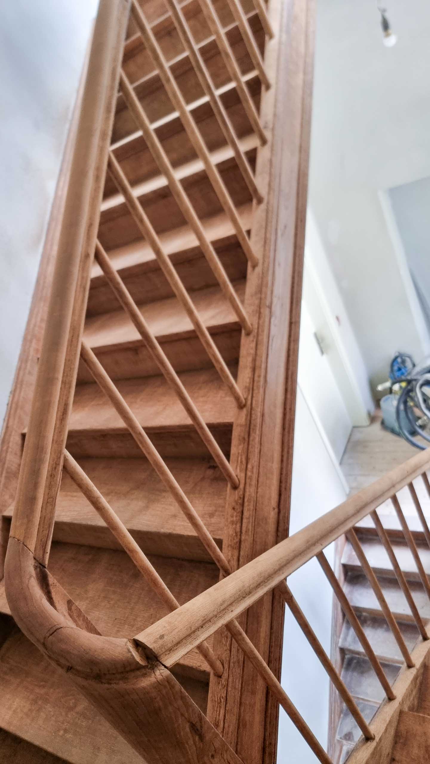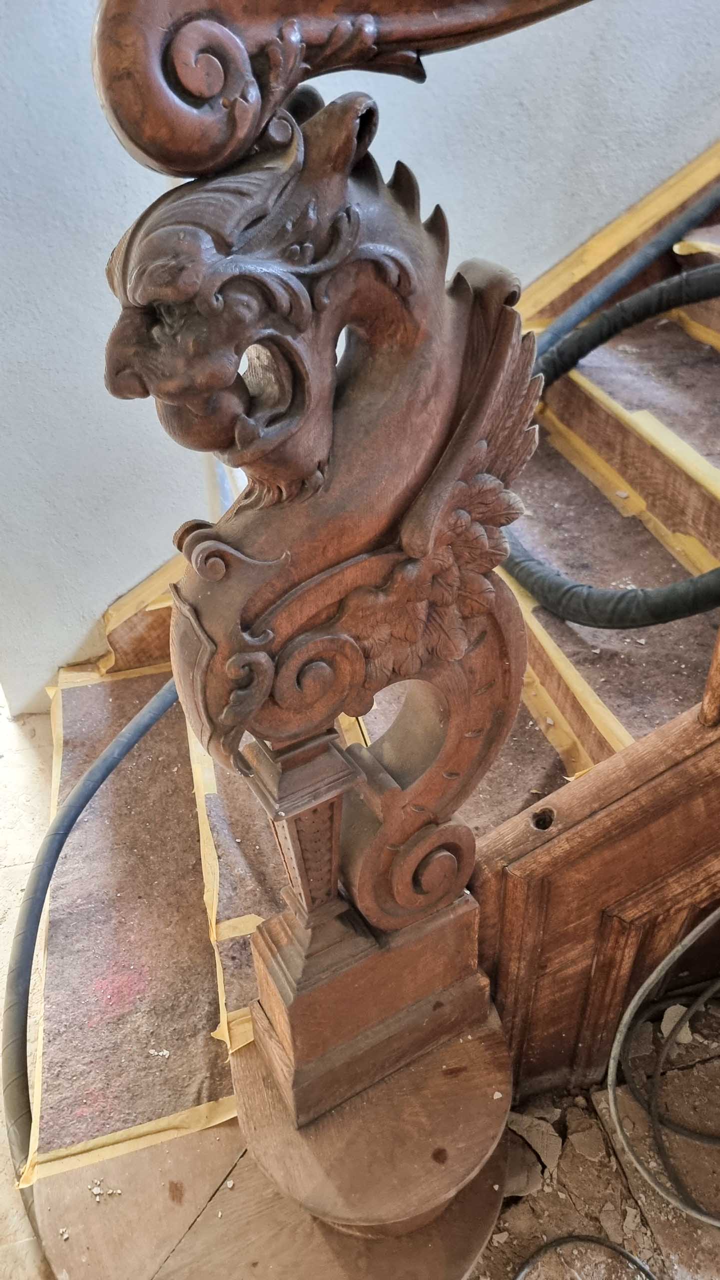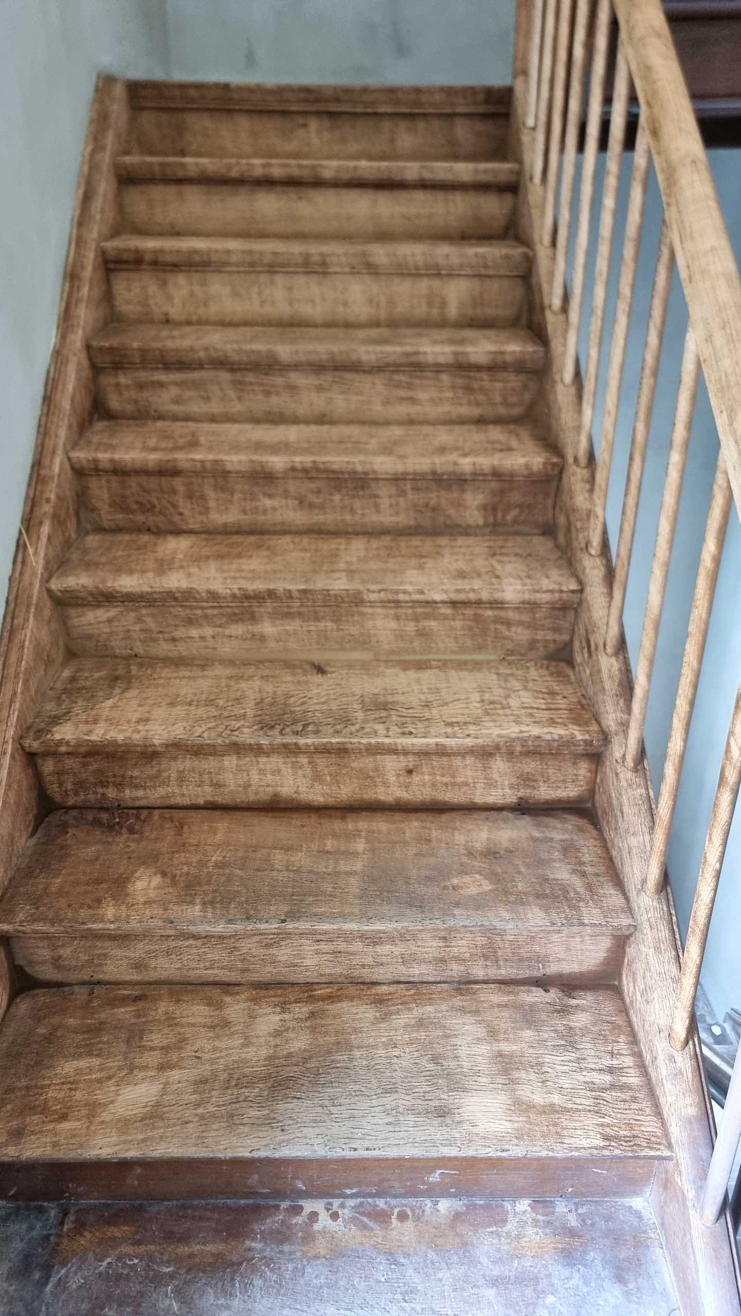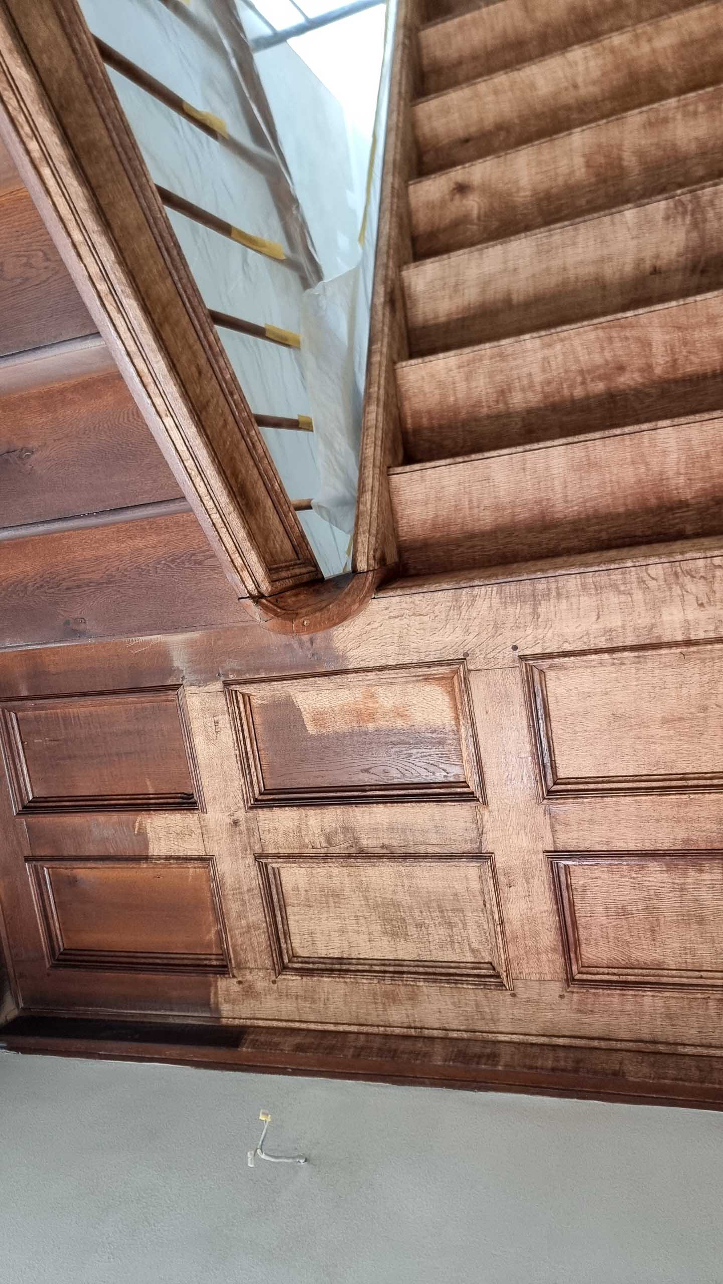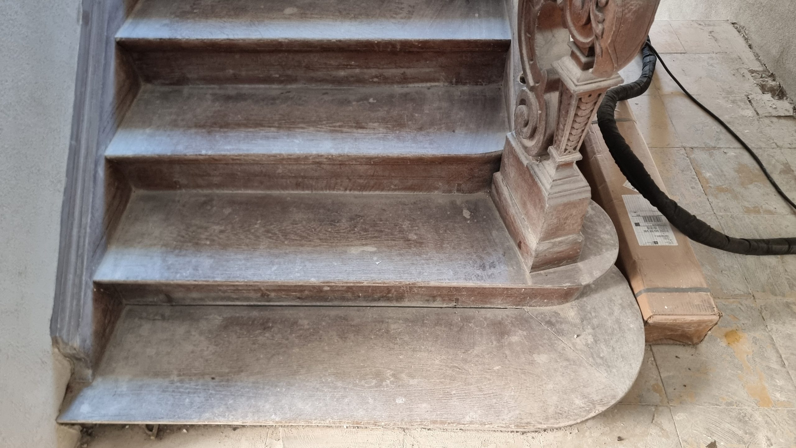 Diese historische Holztreppe war über Jahrzehnte von Schmutz, Lackschichten und dunklen Verfärbungen überzogen – die feinen Details der Holzarbeit kaum noch sichtbar. Ziel war es, die ursprüngliche Struktur freizulegen, ohne das alte Holz zu beschädigen.