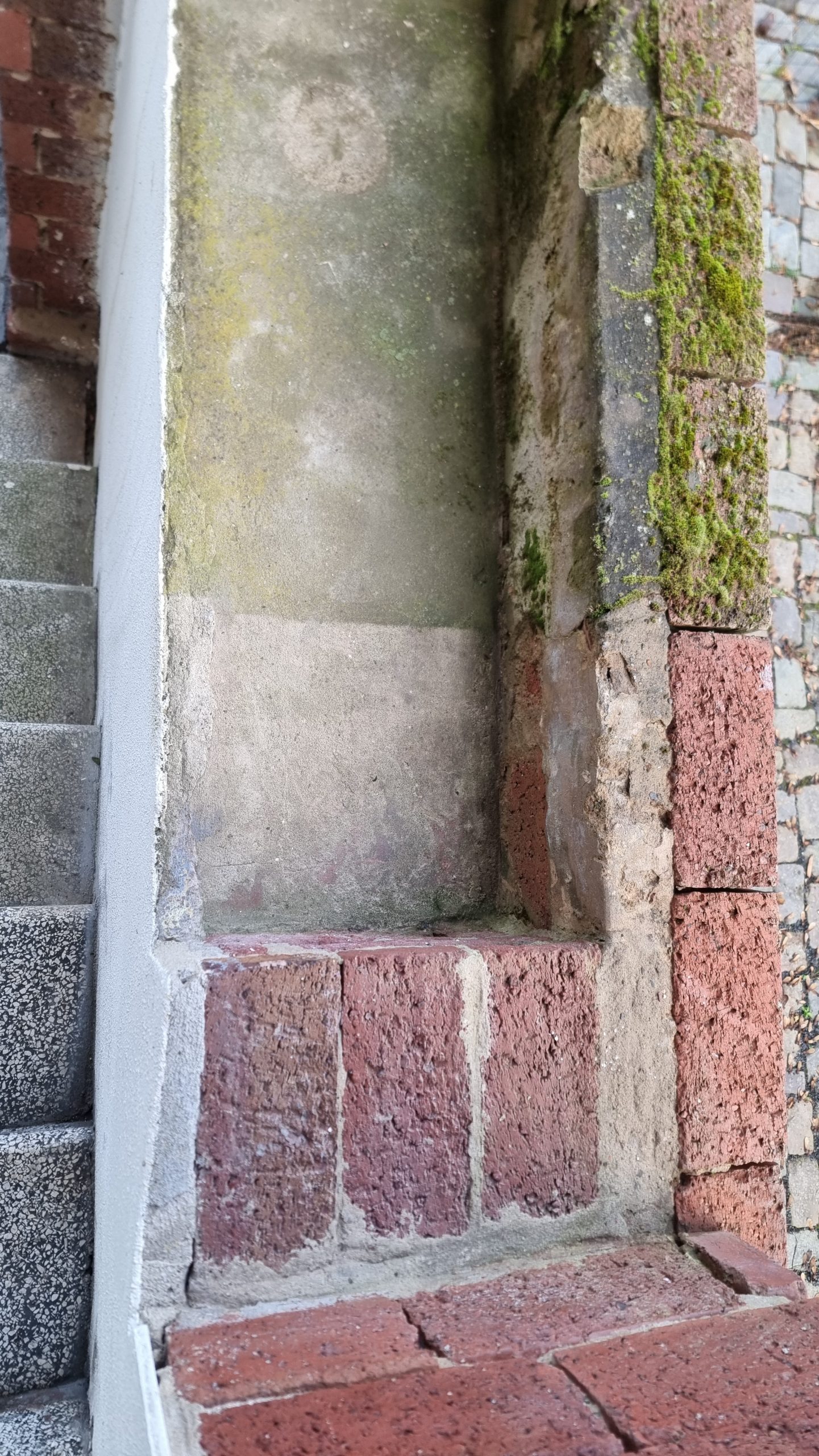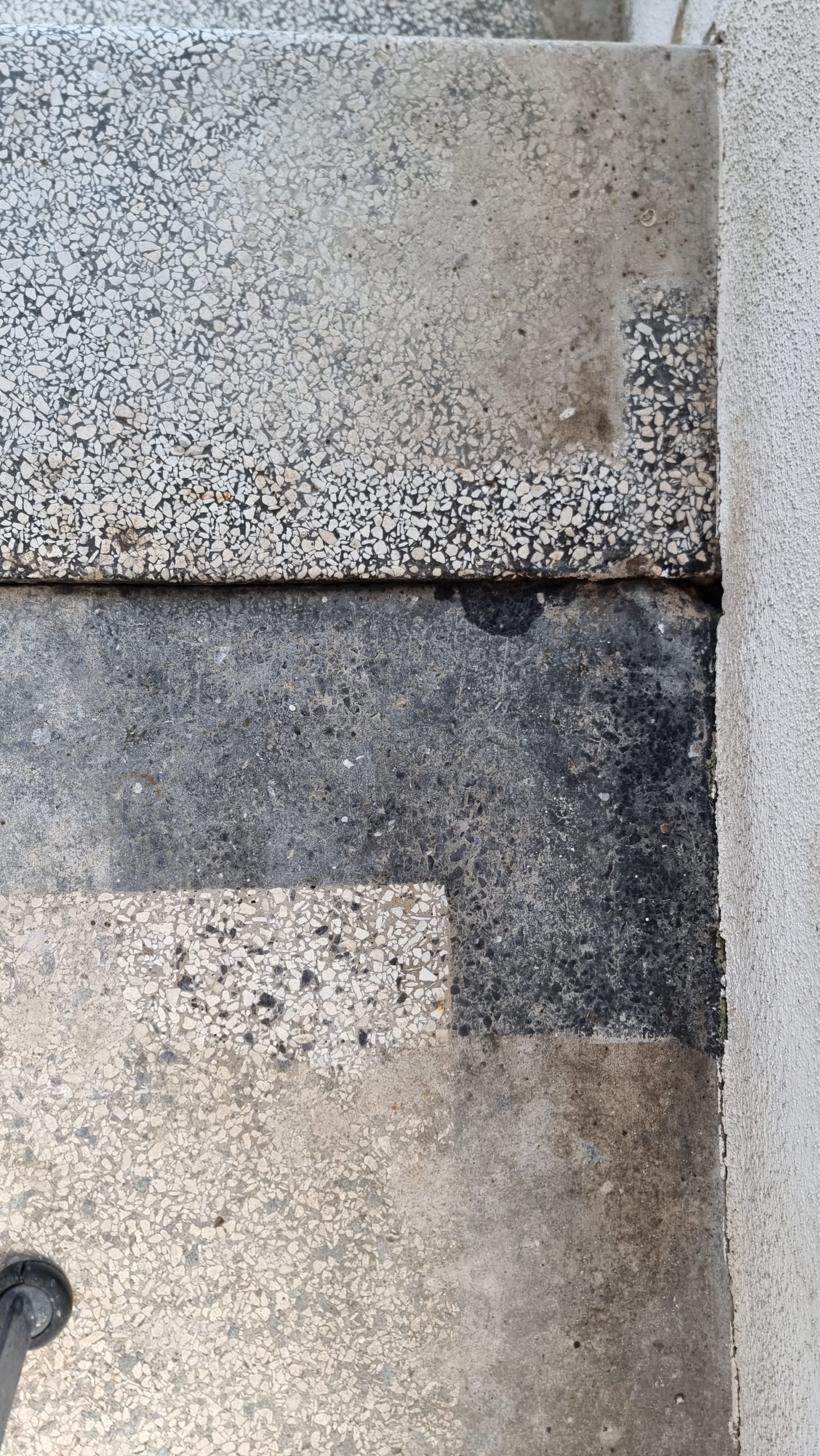 Diese Natursteintreppe im Außenbereich war stark von Algen und Moos befallen. Die Verfärbungen und rutschigen Beläge beeinträchtigten nicht nur die Optik, sondern auch die Sicherheit beim Begehen. Herkömmliche Reinigungsmethoden hätten die empfindliche Steinoberfläche beschädigen können.