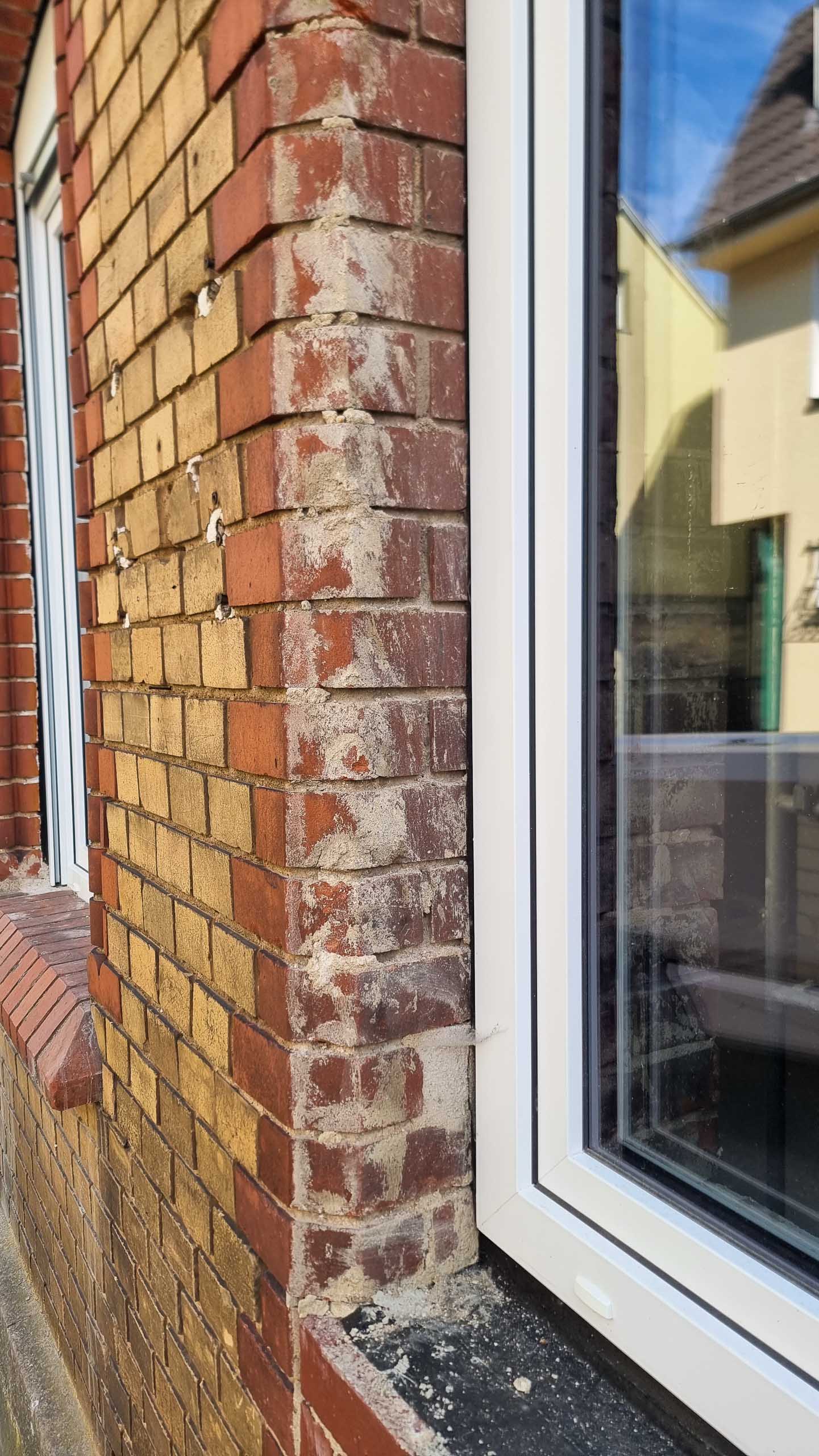 Neue Fenster, alter Dreck – bei diesem Haus mit Klinkerfassade waren die Naturstein-Leibungen rund um die Fenster stark verschmutzt. Mörtelreste, Bauspuren und hartnäckiger Staub hatten sich über Jahre hinweg festgesetzt und trübten das Gesamtbild nach dem Fenstertausch deutlich.